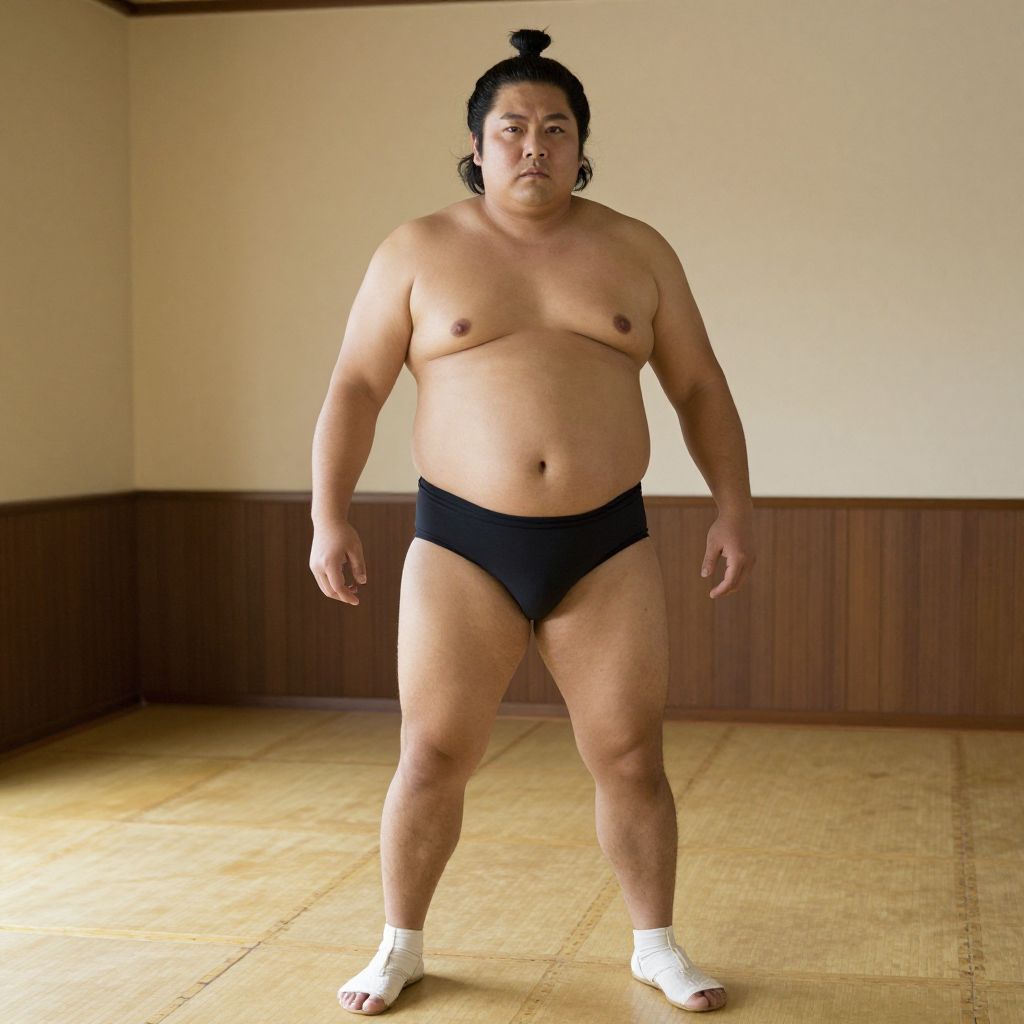 Sumo Wrestler Costume, man with a large belly standing in a room