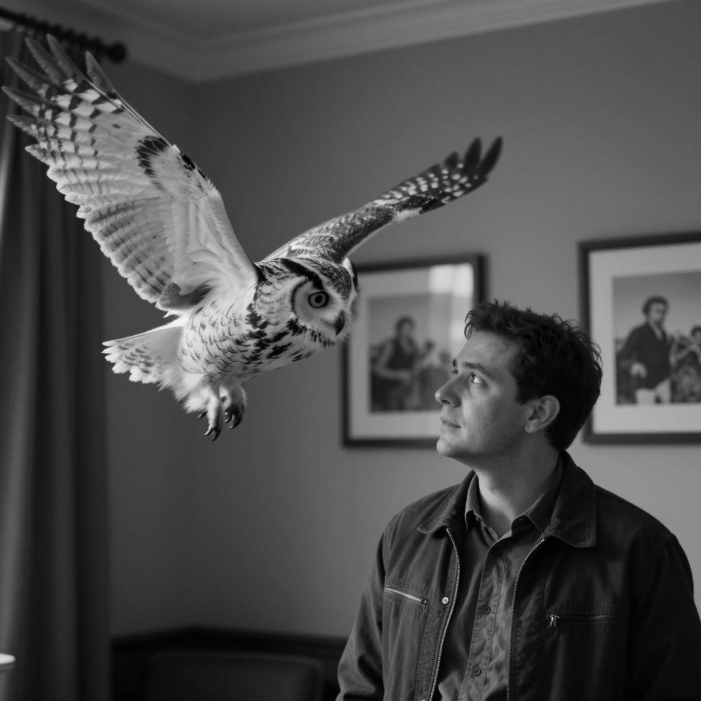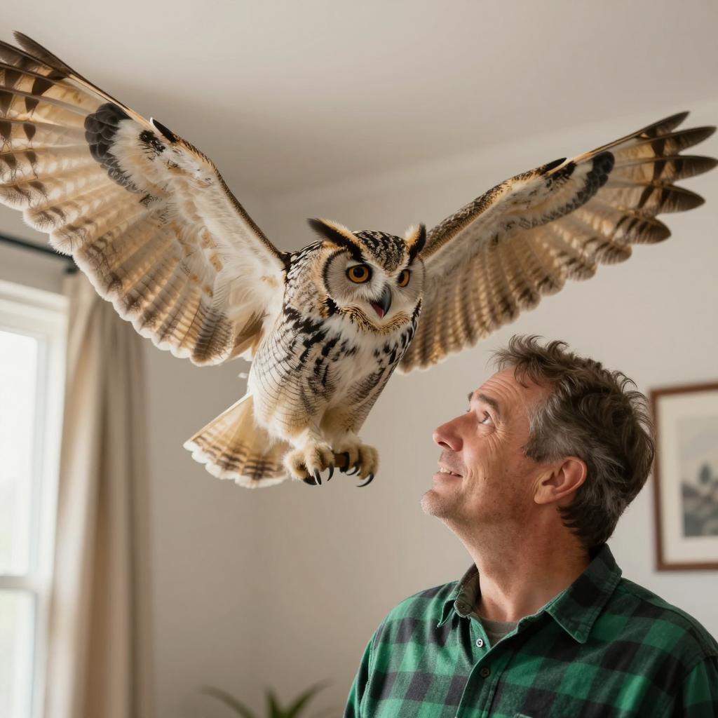 Photograph of a middle-aged man with short brown hair, wearing a green and black checkered shirt, looking up at a large owl with outstretched wings mounted on a wall. The owl's head is slightly open, showing its beak. The man has a subtle smile. Background includes a window with light curtains and a framed picture on the right.