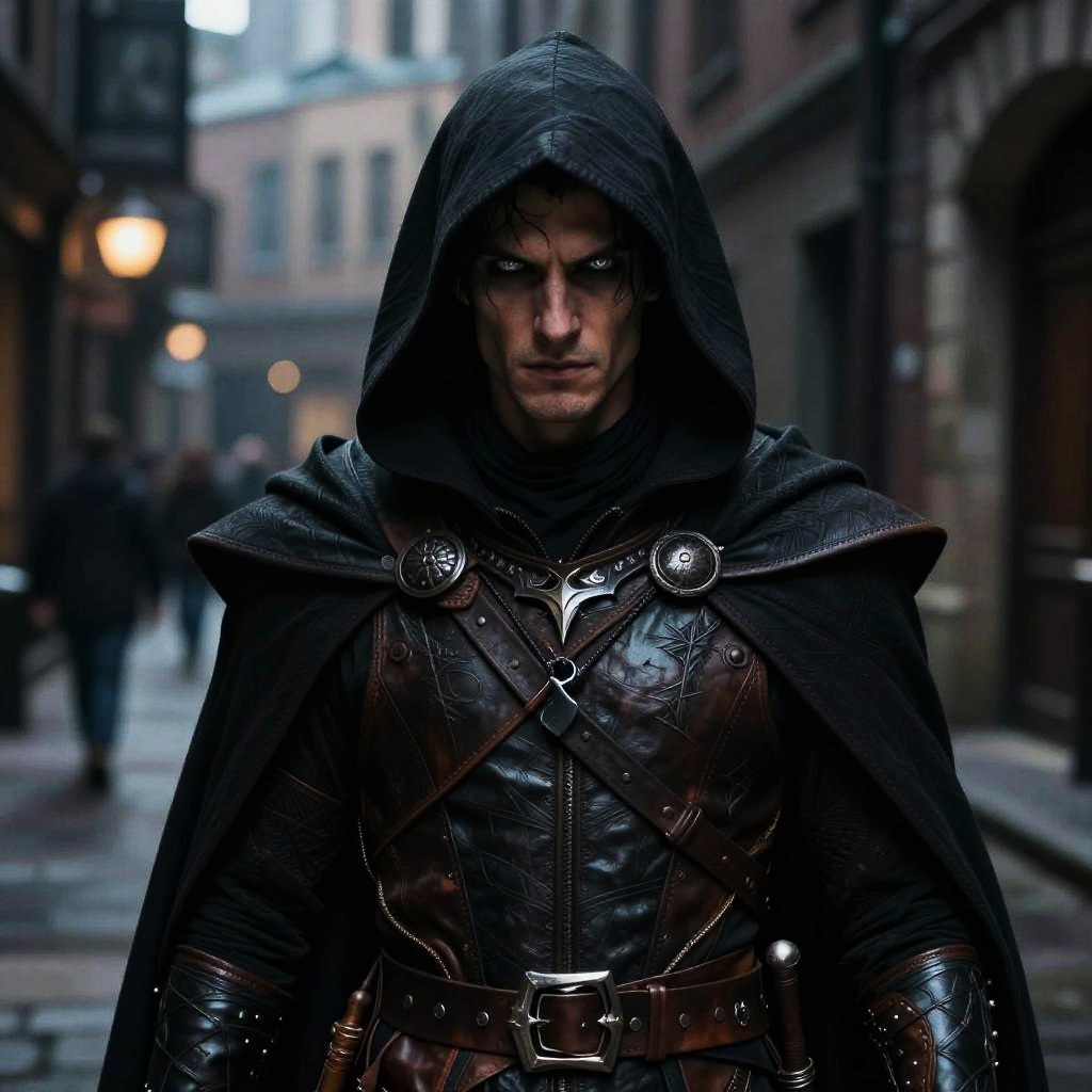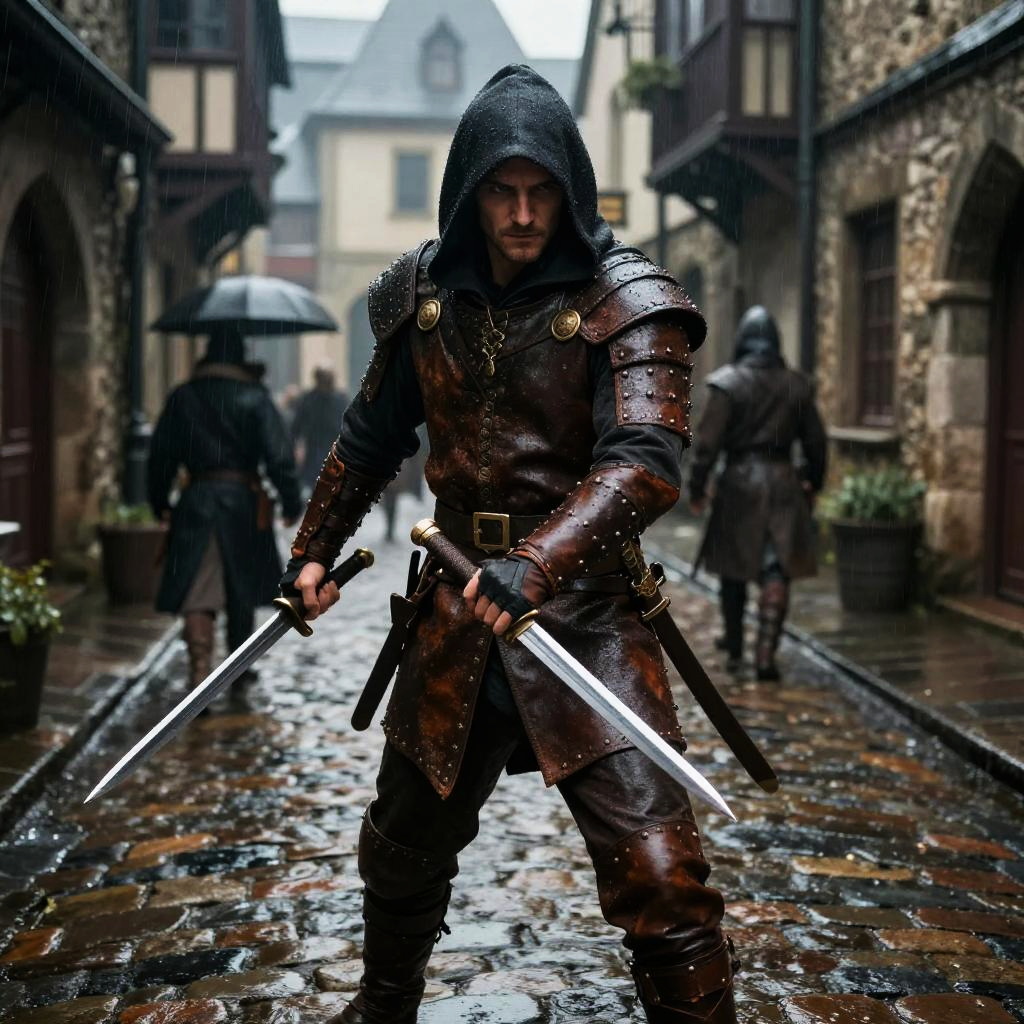 Medieval main character, rugged rogue with hood and leather armor, dual daggers drawn, sneaking through a dark cobblestone alley within a bustling medieval town, rain-soaked atmosphere