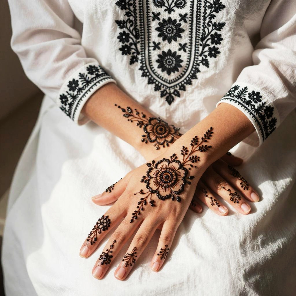 Photograph of a person's hands resting one on top of the other. The hands are adorned with intricate black henna designs featuring a large floral pattern on the lower right hand. The person is wearing a white, long-sleeved, embroidered top with black floral and paisley patterns. Sunlight casts sharp shadows, highlighting the details of the henna and fabric. The background is blurred and neutral.