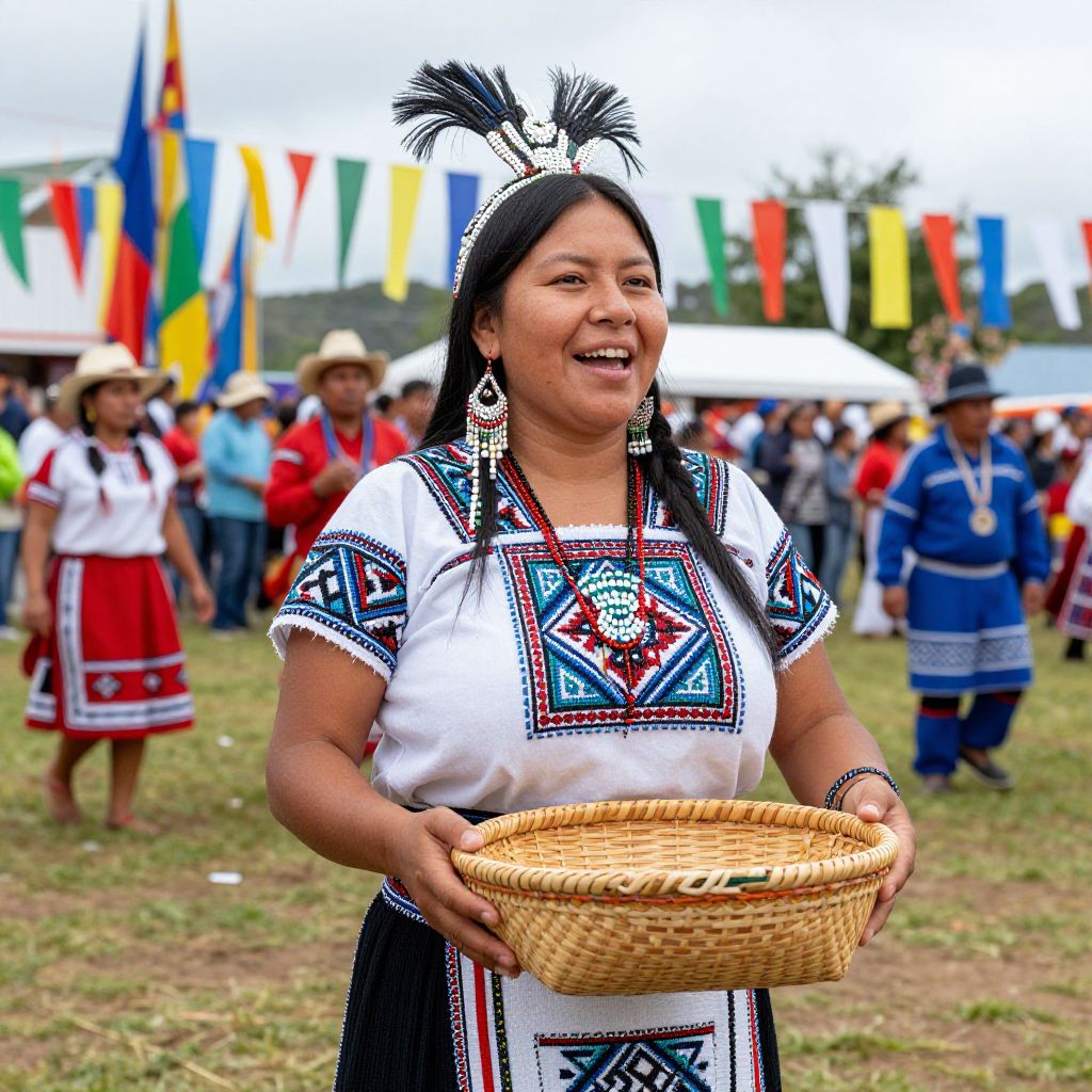 Photographic image of an Indigenous woman dressed in a full traditional costume during a cultural festival, holding a woven basket, standing on a vibrant community gathering ground with colorful flags and dancers in the background, her face showing joyful energy and heritage, wearing a beaded headdress and an embroidered blouse with geometric designs.. The woman has big breasts and cute face