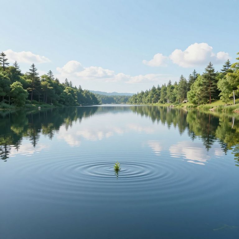 Photograph of a serene, clear lake surrounded by dense, green pine trees under a bright blue sky with scattered white clouds. A single small plant emerges from the calm water in the center, causing gentle ripples. The lake's surface reflects the trees and sky, creating a mirror-like effect. The scene is peaceful and natural, with the forest extending to the horizon, emphasizing the lake's tranquil and untouched beauty.