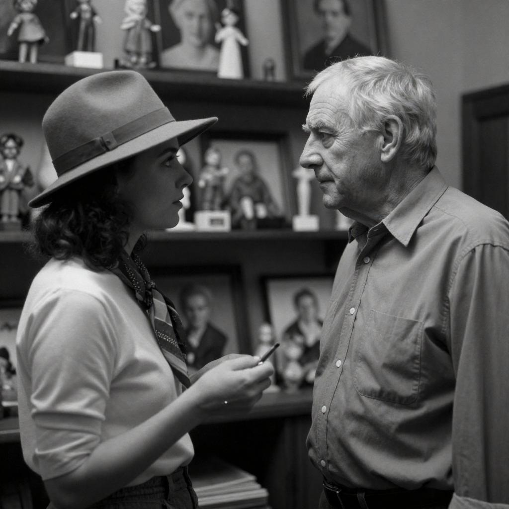 Black-and-white photo featuring an older white man with short gray hair in a button-up shirt facing a younger white woman wearing a wide-brimmed hat, scarf, and a light long-sleeve shirt. They are indoors in a room filled with shelves that display figurines and framed portraits. The woman holds a small object while both are engaged, looking at each other intently.
