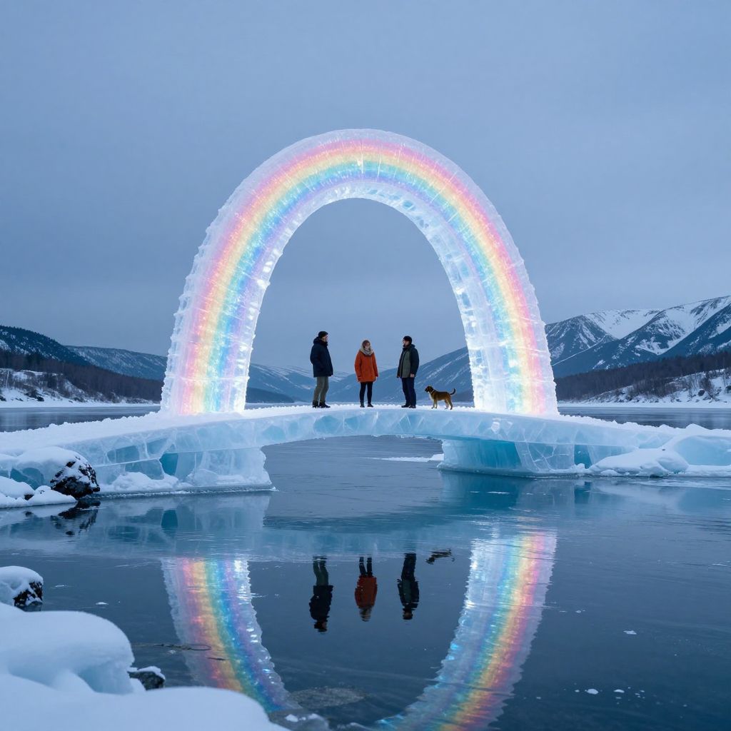 A luminous ice archway, shimmering like a frozen rainbow, spans a tranquil lake, defying gravity as it supports three figures—a man, a woman, and a dog—standing serenely atop its ethereal surface, creating a surreal bridge between two snow-capped worlds.