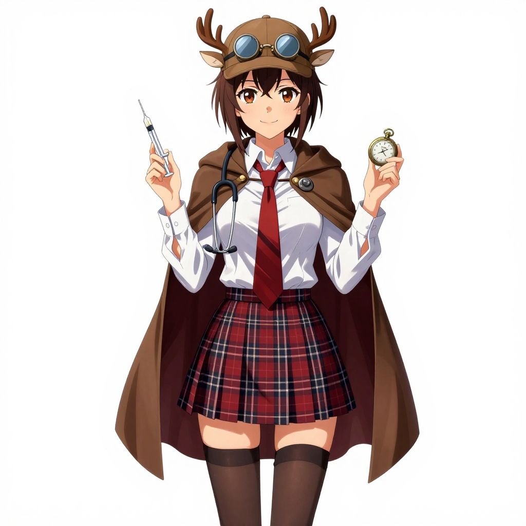 This is a digital anime-style drawing of a young girl with brown hair and brown eyes. She wears a brown deer antler hat with goggles, a brown cape, a white shirt, red tie, and a red plaid skirt. She has black thigh-high socks and holds a syringe in her right hand. A pocket watch hangs from her cape, and a stethoscope is draped around her neck. The background is plain white, focusing attention on her. The character has a cute and confident expression, and the image is brightly colored with clean, sharp lines.