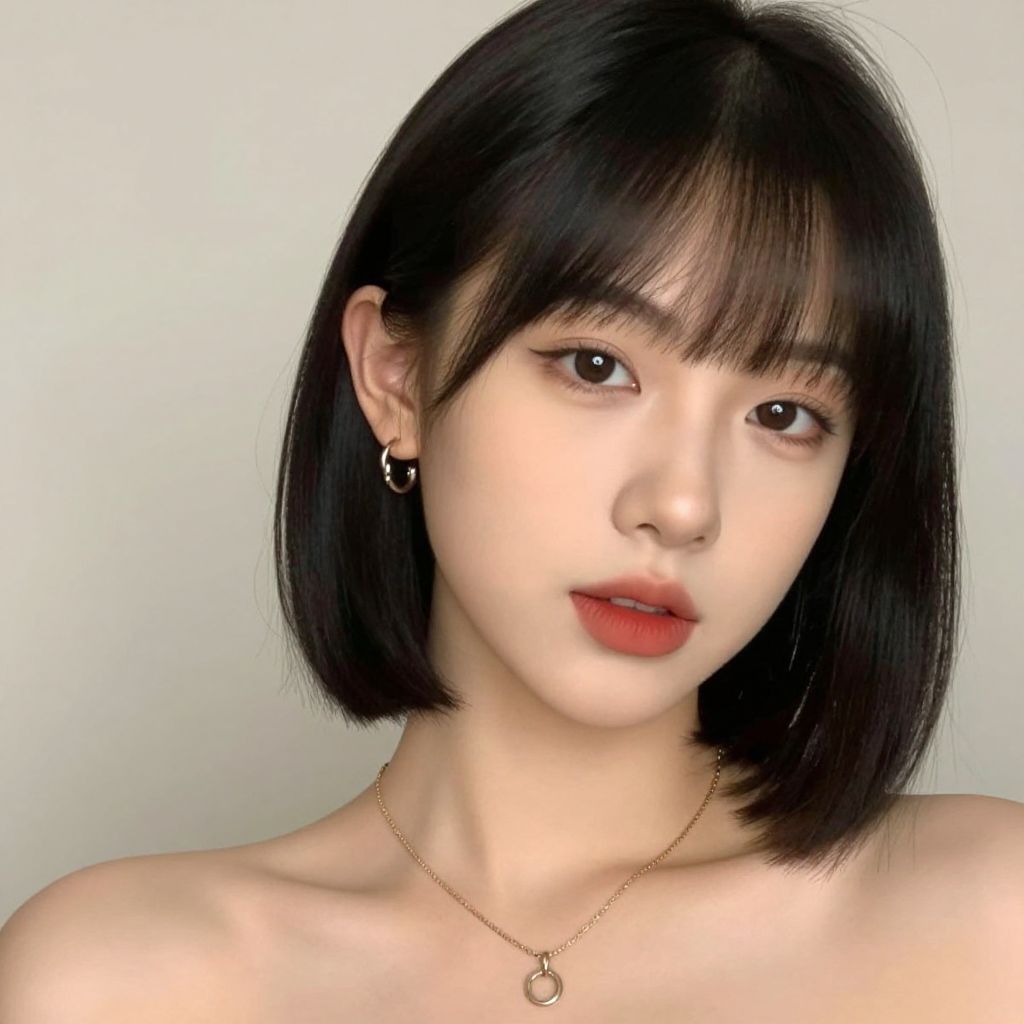 Photorealistic digital portrait of an Asian woman with straight black bob haircut, red lipstick, gold necklace, small hoop earrings, and light skin. Plain