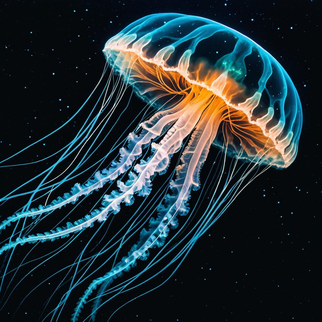 Close-up view of a jellyfish featuring vibrant, glowing inner patterns with translucent and radiant effects against a dark background. The jellyfish's bell is illuminated with hues of blue and orange, showcasing fine details of its tentacles and inner structure, creating a surreal and otherworldly appearance.