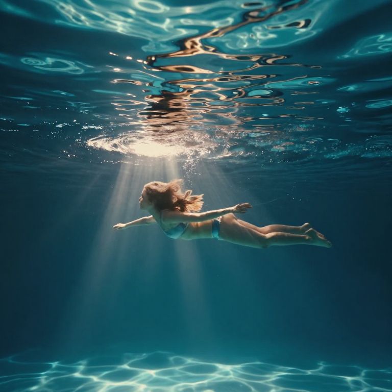 Photograph of a young woman with long, wavy brown hair swimming underwater in a pool. She is wearing a blue bikini and is seen floating with her arms outstretched and legs slightly bent. Sunlight filters down from the surface, creating bright, ethereal beams that illuminate her and the surrounding water. The water's surface above is rippled, reflecting light and casting dynamic patterns on the pool floor below. The overall color palette is deep blue with bright light accents, creating a serene and tranquil atmosphere.