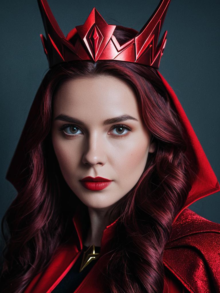 Woman in Scarlet Witch Costume, close-up detailed headshot with crown