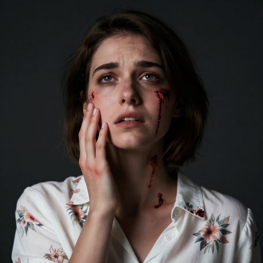 Woman with blood streaming from her forehead, wearing black leather fingerless gloves, arms raised, mouth open in pain. Dark wet hair, visible earrings. Background: white tiled wall, white bathtub, brass faucet. Intense, distressed expression. Close-up, upper body.