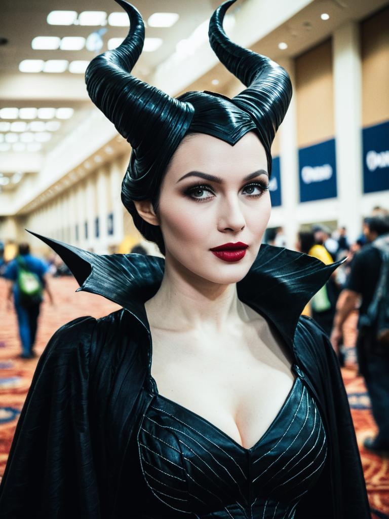 Photograph of a pale-skinned woman with black, glossy, horned hair and dramatic black outfit, red lips, in a brightly lit convention hall