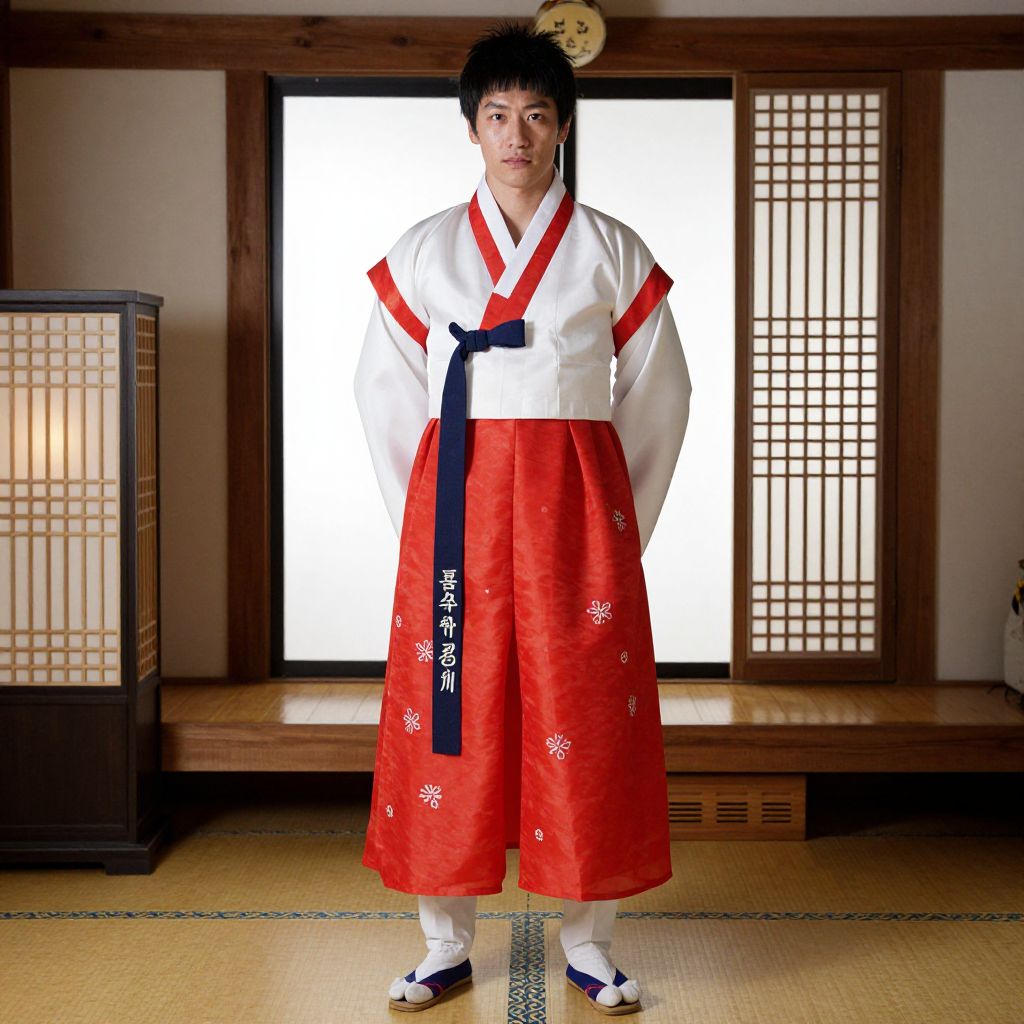 Kenshin Costume, man in a red and white hanbok standing in a room
