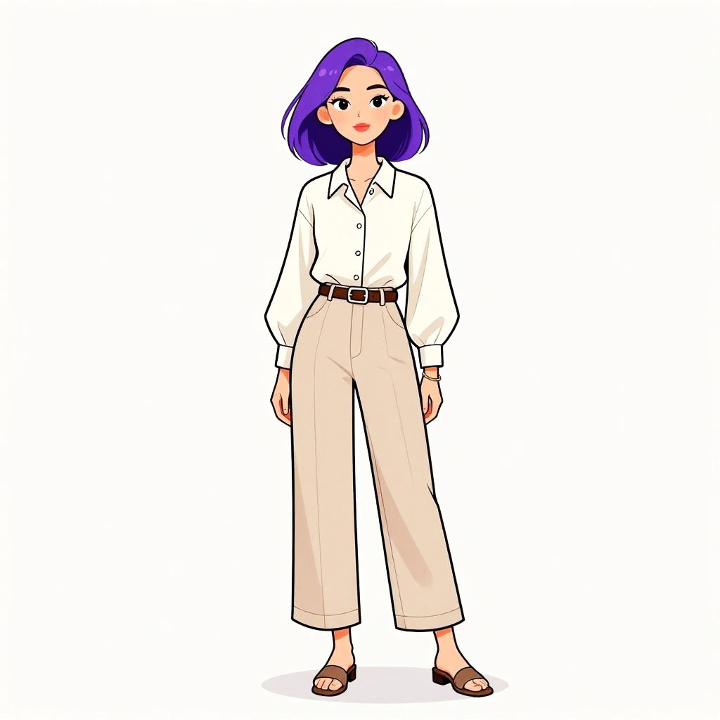 Woman with pretty face and pretty hair. Woman, modern minimalism, ivory silk blouse with a pointed collar and button-down front, long sleeves with buttoned cuffs, tucked into high-waisted wide-leg trousers in a neutral beige tone, brown leather belt with a small buckle, minimal accessories with thin bangle, open-toe flat sandals in a matching beige color, plain white studio background. --sref 1461