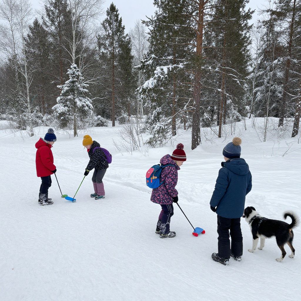 Children enjoying winter outdoor activities in Scandinavia's snowy landscape, surrounded by trees, with a playful dog observing nearby.