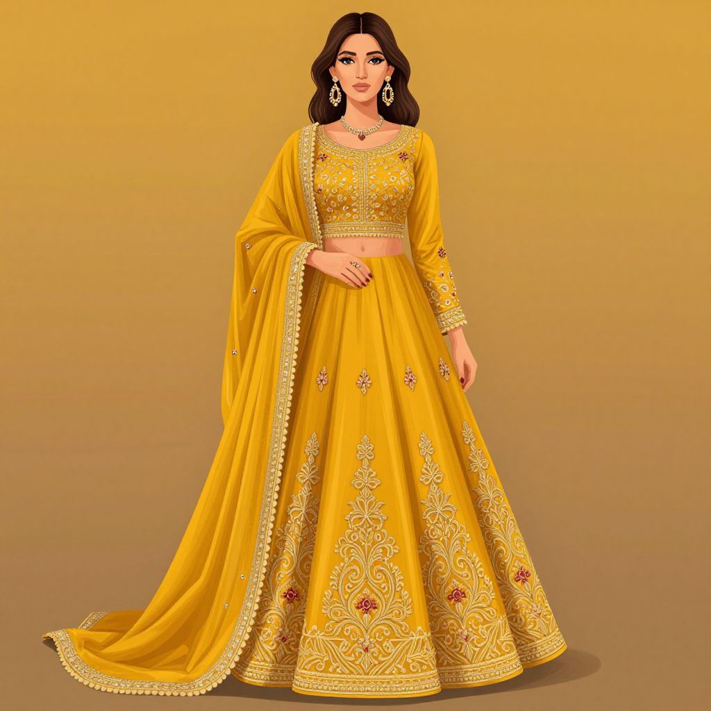 A vibrant digital illustration showcases a woman elegantly dressed in a traditional Pakistani gown, featuring intricate embroidery and a flowing mustard-yellow fabric, exemplifying the artistry of contemporary dress designers.