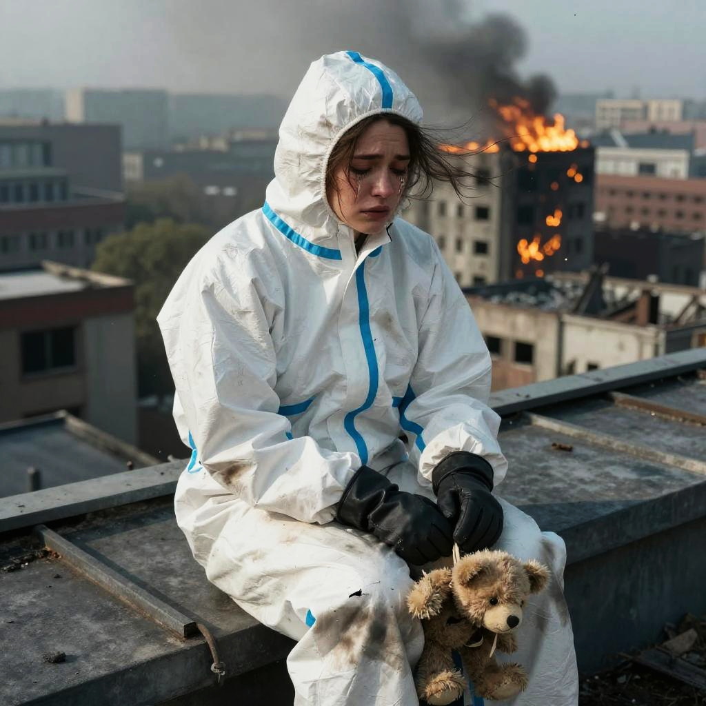 Photograph of a young woman with fair skin and brown hair, wearing a white hazmat suit with blue accents, black gloves, and holding a small brown teddy bear. She sits on a concrete rooftop against a backdrop of urban buildings with one on fire, emitting thick black smoke. Her expression is somber and distant. The rooftop is gray and weathered, with the cityscape extending into the hazy background. The image evokes a sense of tension and uncertainty. The overall tone is dramatic and contrasting, highlighting the juxtaposition of the woman's protective gear against the urban chaos.