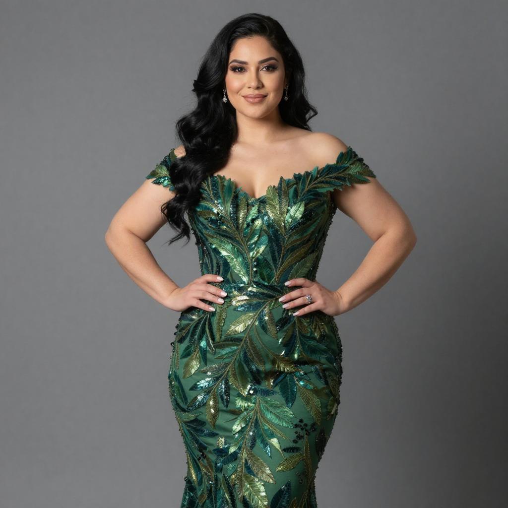 Photograph of a curvy woman with long black hair, wearing an off-the-shoulder, green, leaf-patterned gown that hugs her figure. She stands confidently against a ured gray wall, hands on hips, with a subtle smile. The gown features intricate, shimmering leaf designs and a fitted bodice, accentuating her hourglass shape.