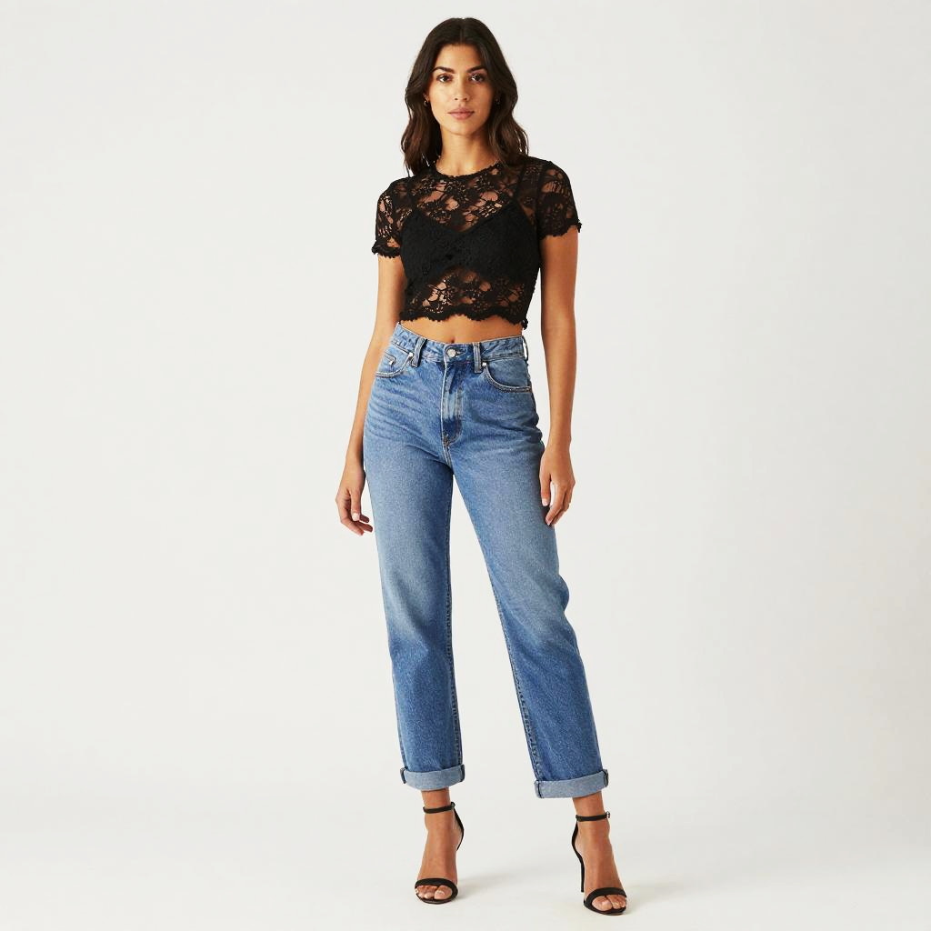 Photograph of a young woman with medium-length dark brown hair, wearing a black lace crop top with short sleeves and high-waisted, light blue, cuffed jeans. She's standing with a relaxed posture, looking slightly to the left. She's also wearing black, open-toed high heels with ankle straps. The background is plain white, making her the focal point. She has a light olive skin tone and a confident expression.