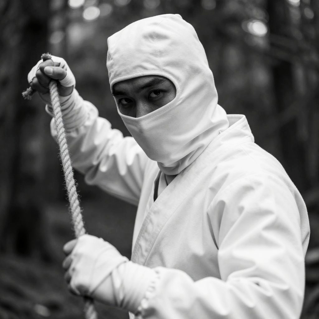 Black and white photograph of a man in a white ninja outfit, hood covering head, face partially visible with intense gaze. He holds a rope in his right hand, outstretched arm. Dense forest background. Both hands wrapped. Foreground slightly blurred.