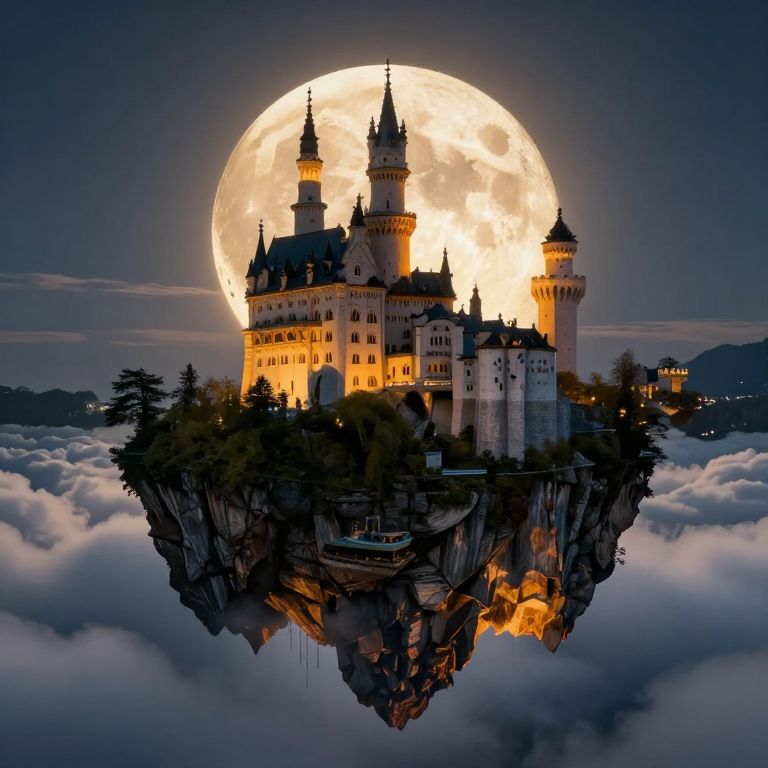 Photograph of a fairy-tale castle with multiple towers, illuminated by a full, glowing moon, floating above a cliff amidst fluffy clouds.
