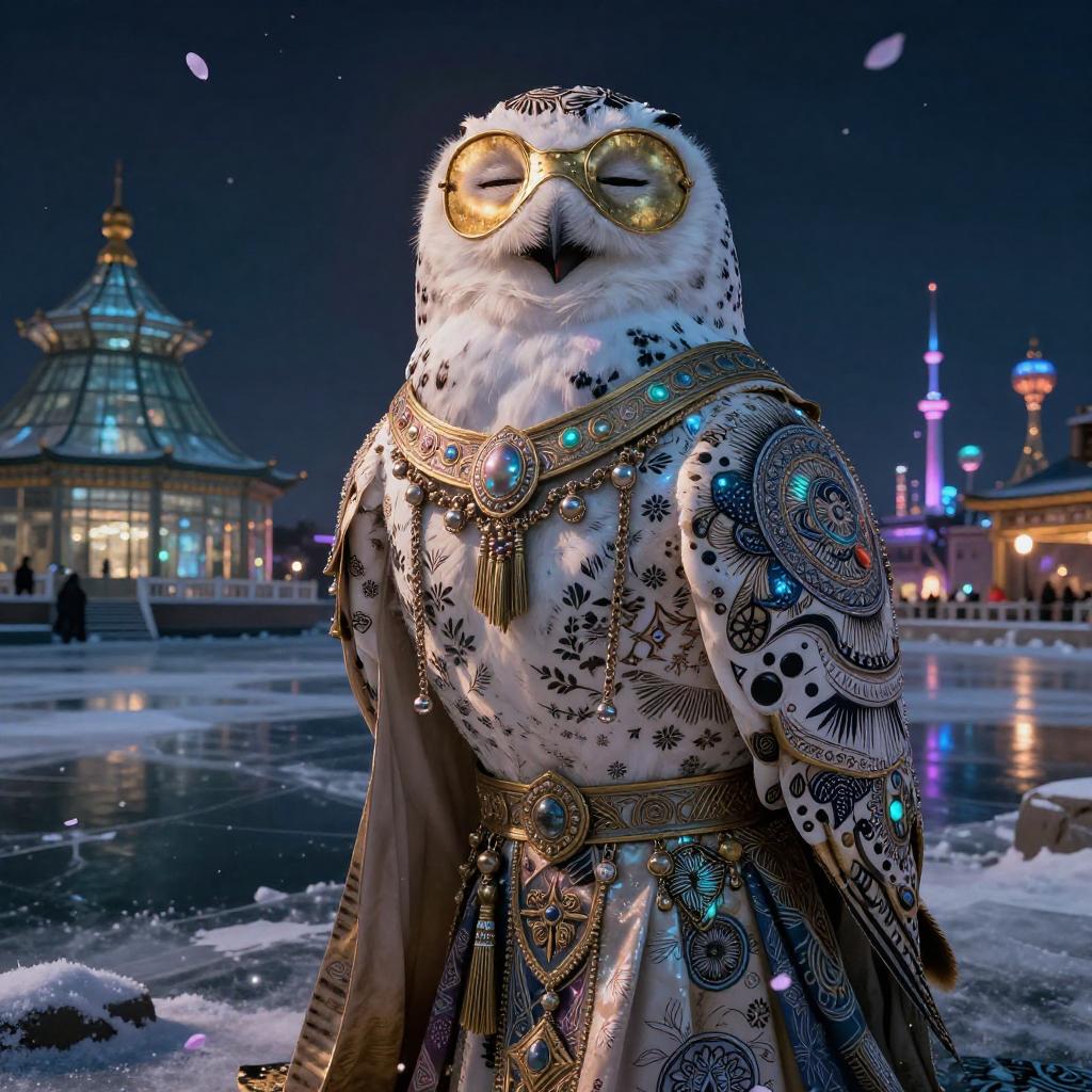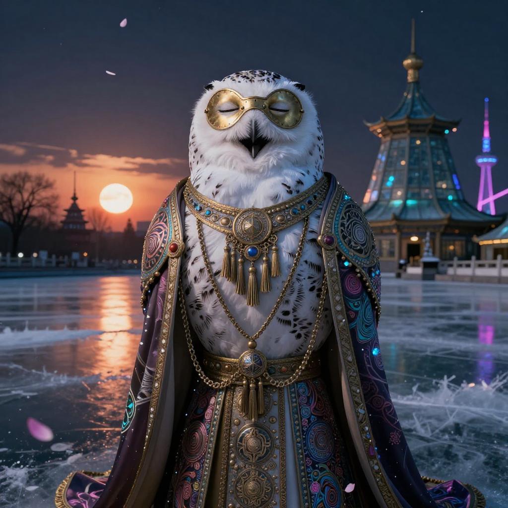 Best quality, masterpiece, ultra high res, raw photo, beautiful and aesthetic, deep shadow, dark theme, (photorealistic:1.4), masked snow owl oracle with iridescent plumage and a brass ocular mask, wearing ornate ceremonial alloy mantle woven with layered silk stoles, chain tassels, and intricate zentangle filigree, soft smile, open mouth, closed eyes, ((chiaroscuro, backlight, sunset, petals floating)), graceful poise, evocative atmosphere, magnetic presence, captivating mystique, intricate zentangle patterns, astonishing level of detail, striking perspective, a chaotic masterpiece balanced by harmony, vibrant color palette, ((outdoors)), moonlit frozen courtyard of a glass pagoda beside a black-ice canal, neon futurist spires on the horizon, drifting bioluminescent petals like snow at polar twilight, inspired by futurist architecture