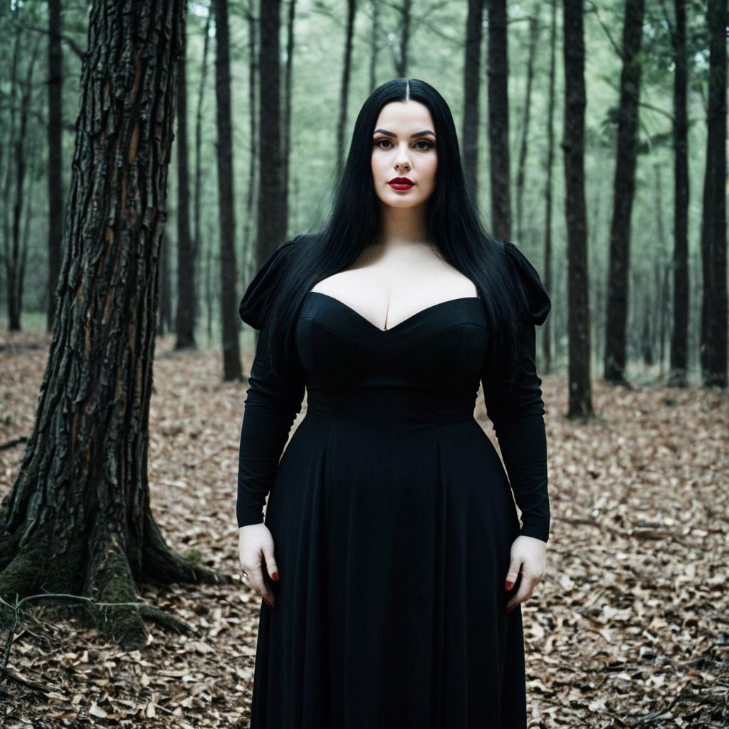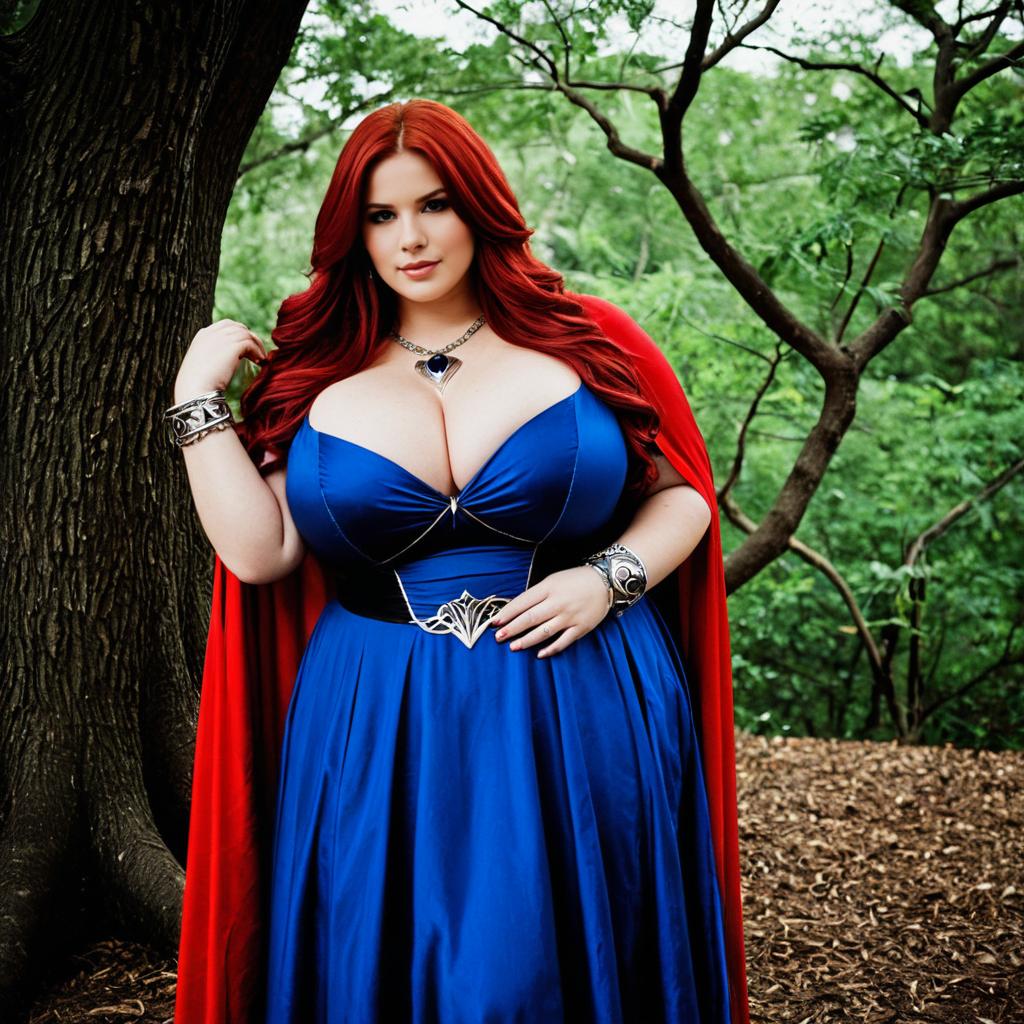 Plus size plus cosplay,1girl, solo, breasts, long hair, tree, dress, red hair, cleavage, outdoors, short sleeves, puffy short sleeves, curly hair, puffy sleeves, large breasts, looking at viewer, nature, standing, forest, lips