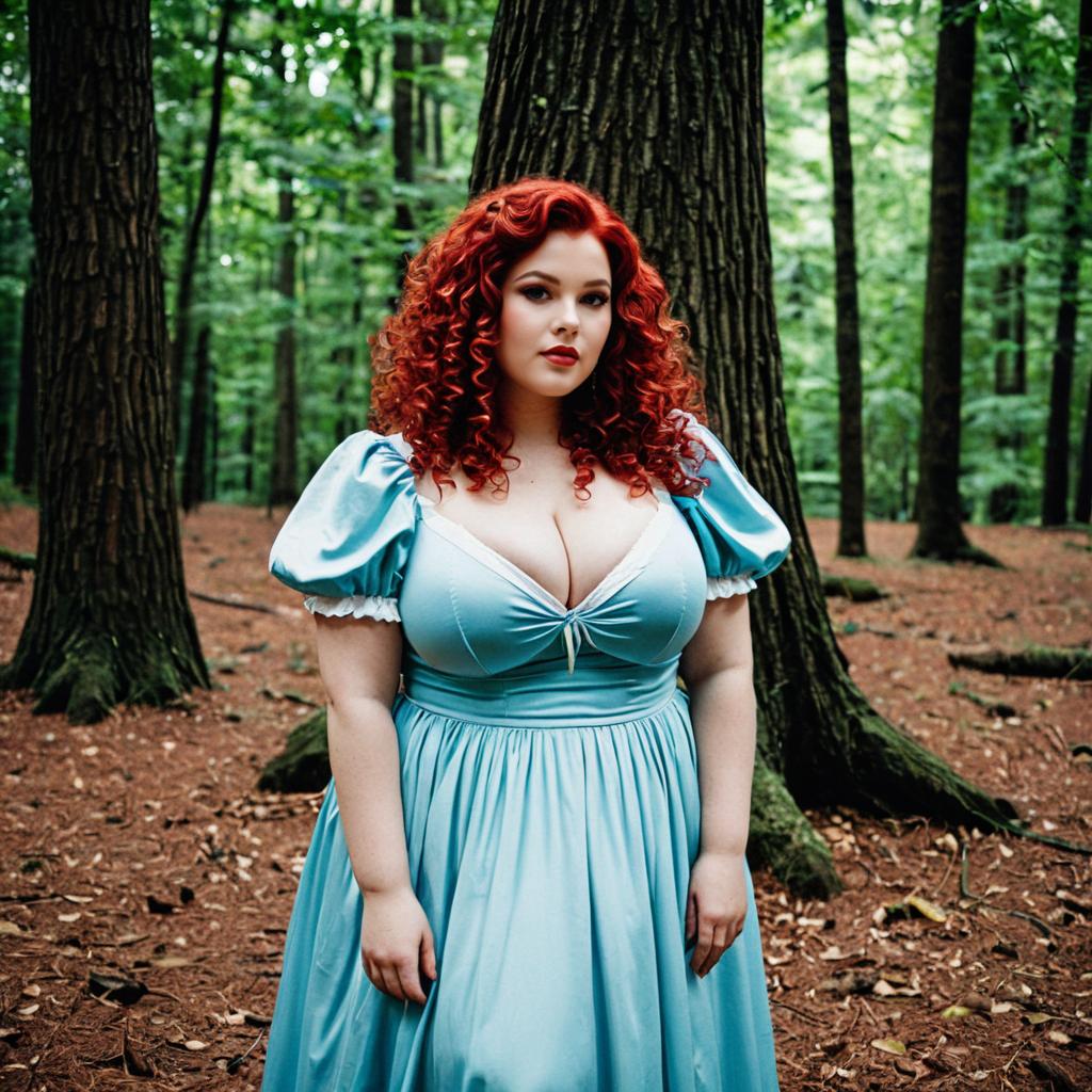 Portrait of a plus size woman with long curly red hair wearing a light blue dress with puffy short sleeves standing in a dense forest. She poses confidently outdoors among tall trees, looking directly at the camera with subtle makeup and red lipstick.