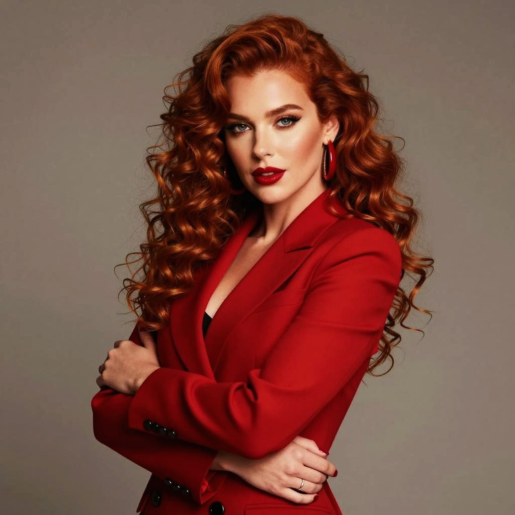 A woman with striking curly red hair styled in voluminous waves poses confidently against a muted background. She wears a bold red outfit with matching accessories, highlighting a glamorous and polished look in a modern portrait style.