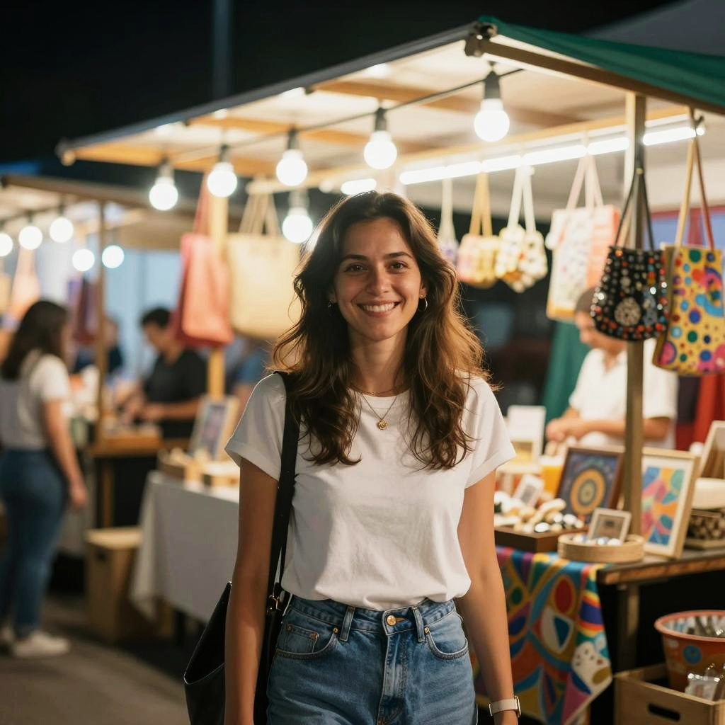 Smiling Woman Shopping at Artisan Market
