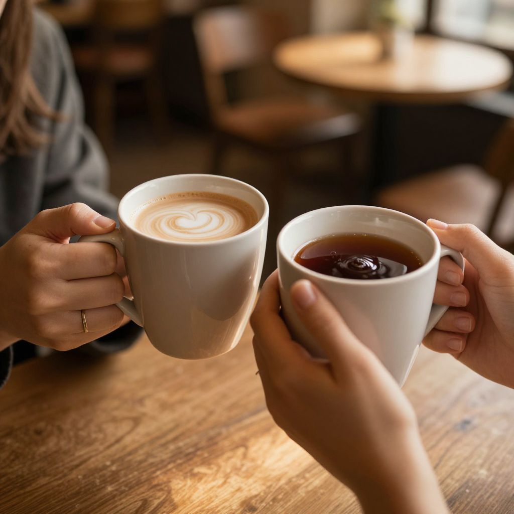 Photograph of two hands clinking white ceramic cups, one with latte art, the other with dark coffee, on a wooden table in a cozy
