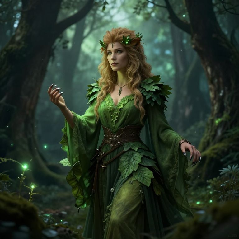 Leonin DnD 5e female druid in a mystical forest, her leonine features blending with natural surroundings, flowing green robes adorned with leaves and claws, magical aura glowing softly, ancient trees and ethereal lights around, fantasy style