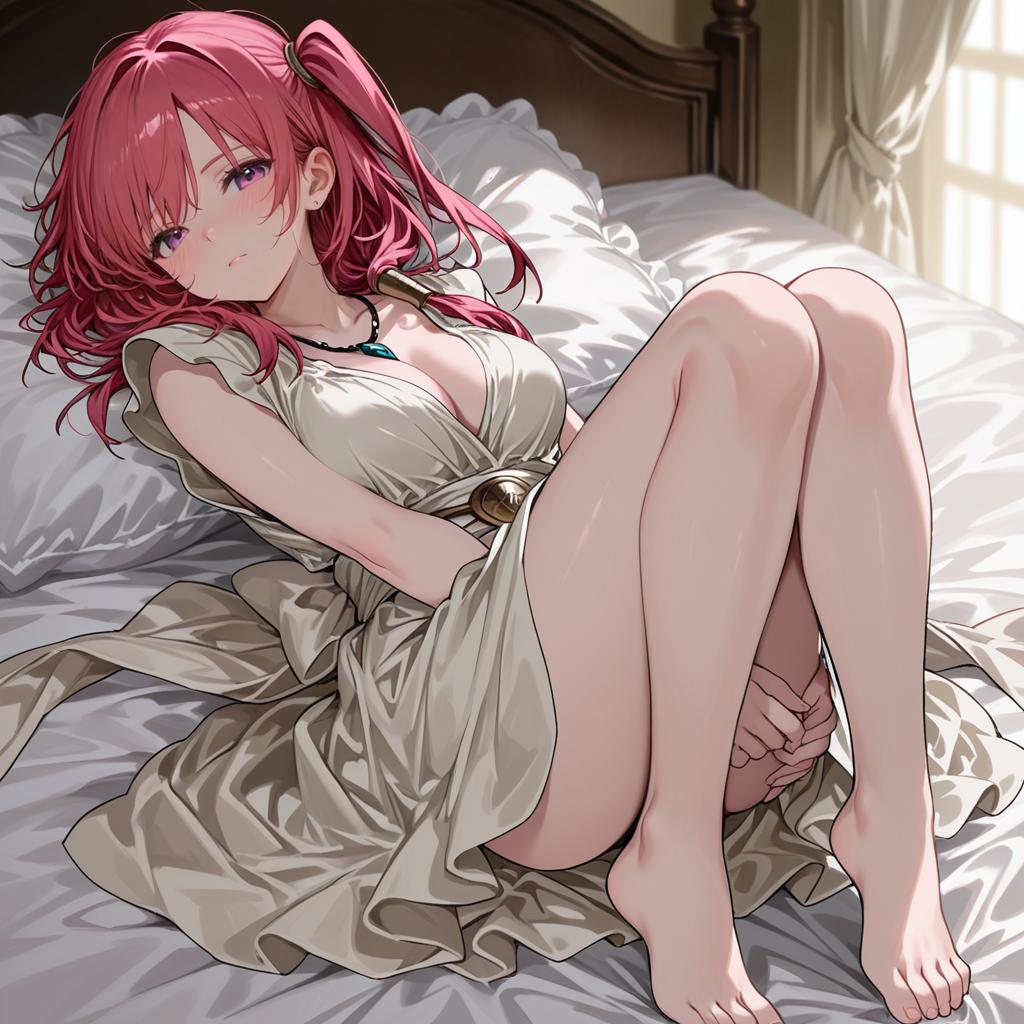 Digital illustration of Morgiana from Magi The Labyrinth of Magic. The anime girl has long red hair styled with one side up, red eyes, and medium breasts. She is barefoot, sitting on a white bed with wooden headboard and beige curtains in the background, wearing a beige dress with a belt and a blue pendant necklace. The artwork is detailed and by artist Aogisa.