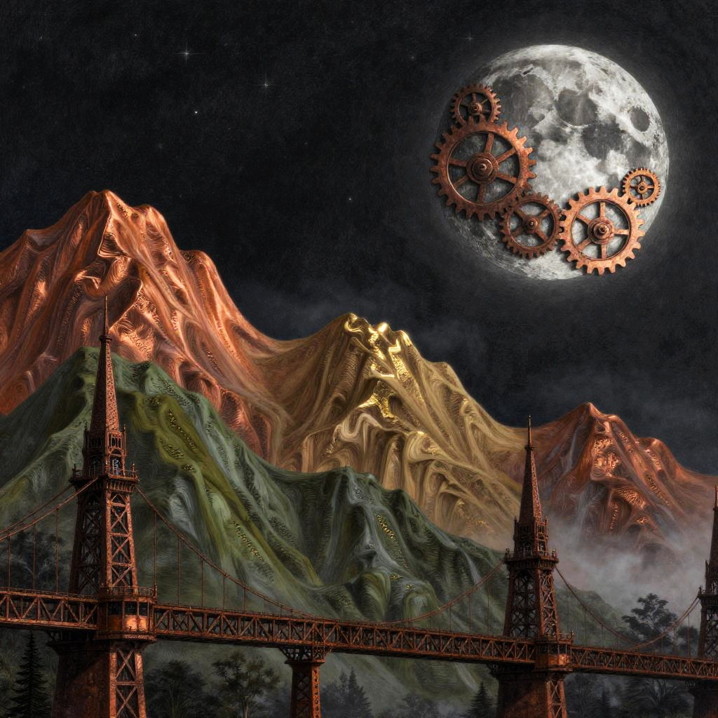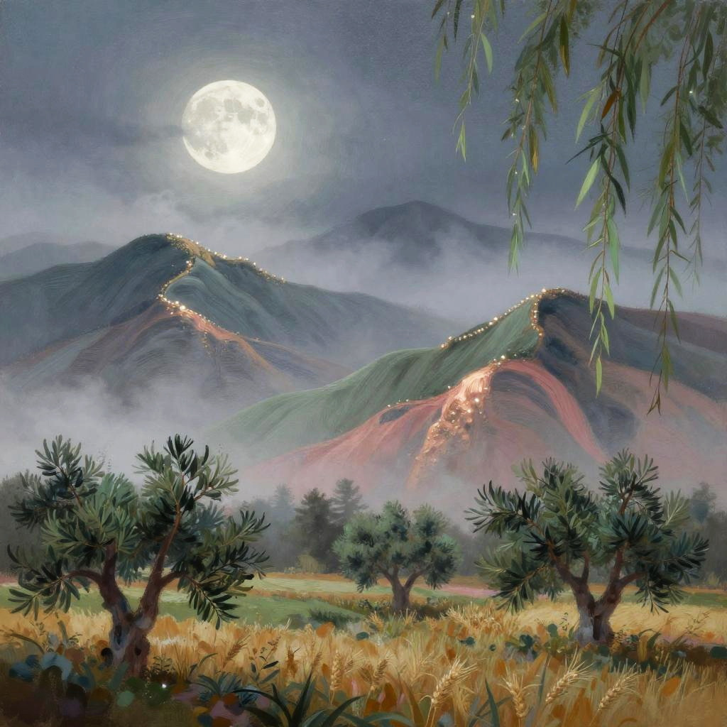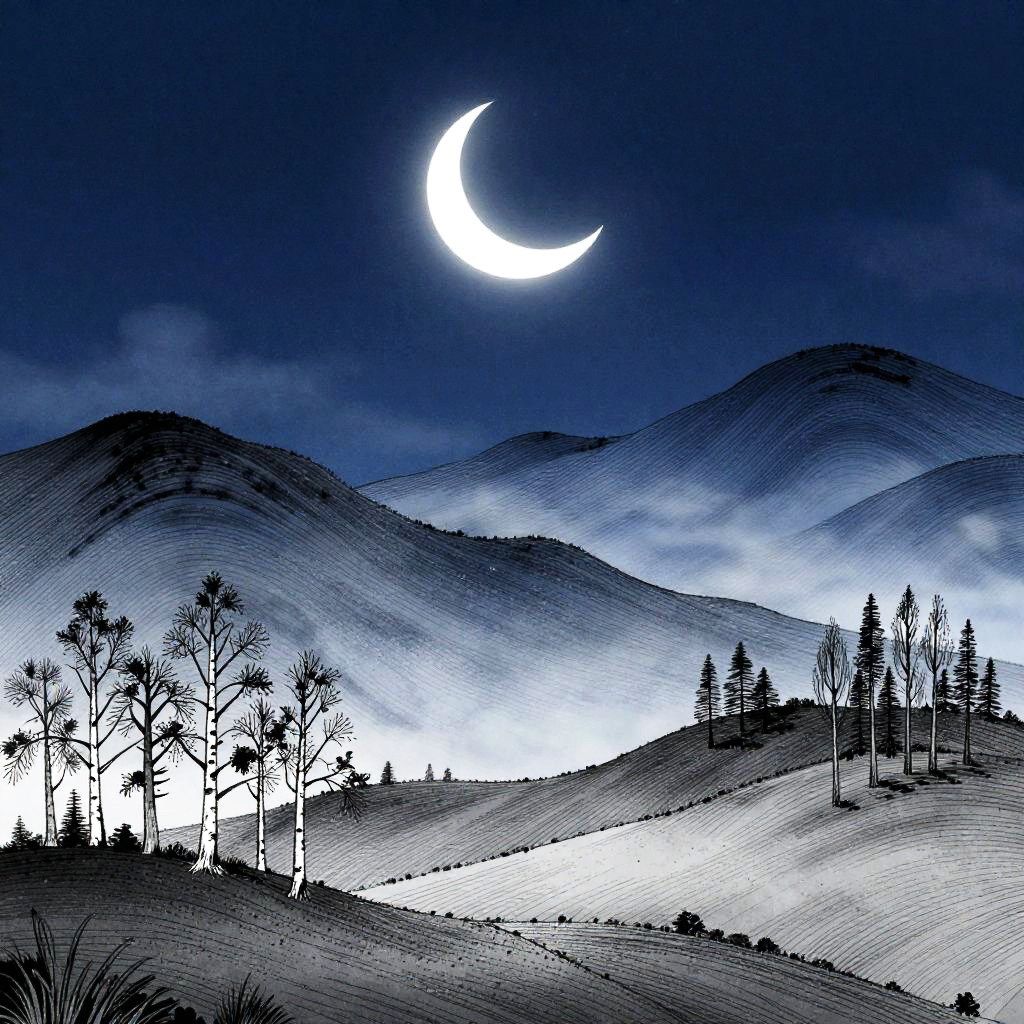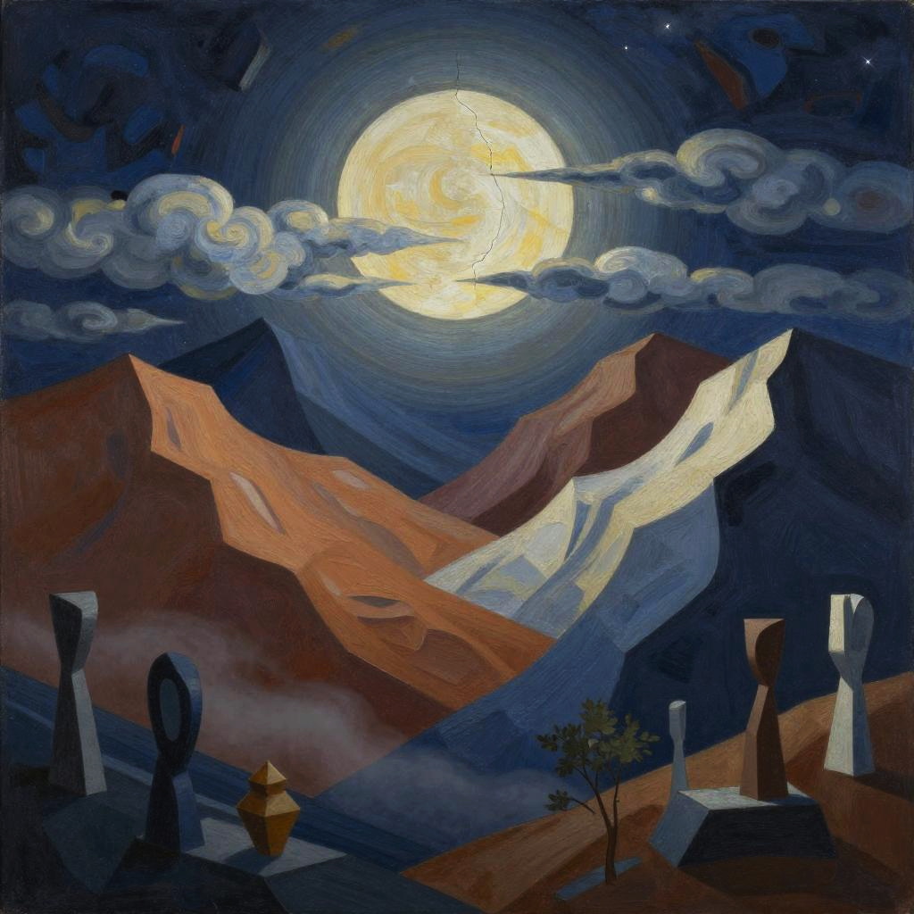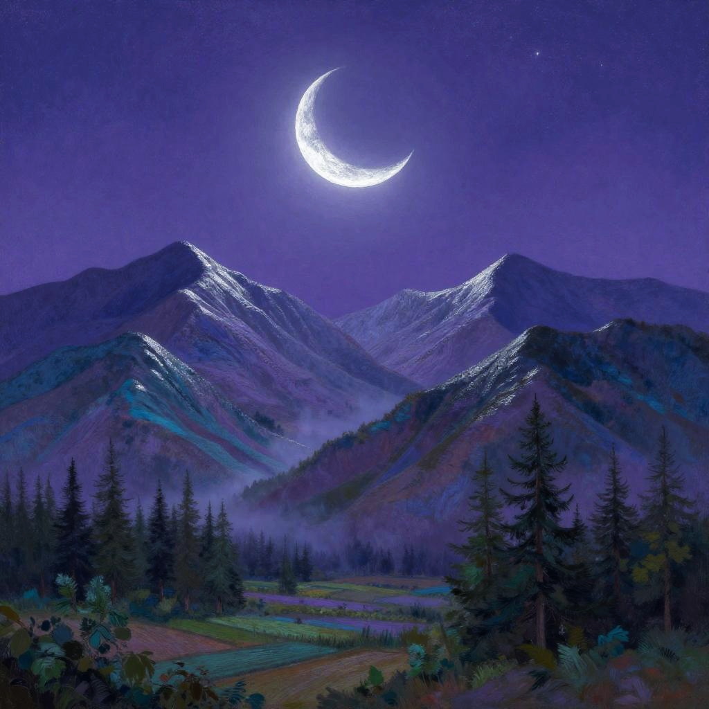 Dreamy nocturne in low-poly geometric, featuring a faceted glowing moon casting soft shadows on astral background. Wavy multicolored mountains arc across the midground in cerulean, mauve, and chartreuse with pale yellow edges, guiding the eye to silver birches and lavender meadows in the foreground. Textured starfield, soft glow, luminous edges, drifting mist between peaks, high detail, richly saturated yet balanced, tranquil atmosphere, wide composition.