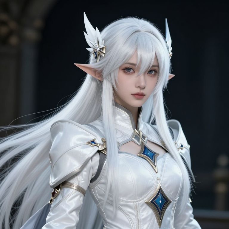 A stunning, curvaceous elf beauty stands majestically in front of a high tech detailed spaceship corridor, her luscious locks styled in an exquisite waterfall braid that cascades down her back like a white veil tucked behind her pointed ears, Her face is confident, The soft, ambient lighting accentuates the delicate features of her perfect face and the contours of her toned physique, while vibrant colors and intricate details bring the scenery to life, Her face is flawless and clean with no markings or tattoos, Her formfitting exosuit is royal blue and yellow with glowing green accents and fits her perfect body tightly and creates a pronounced camel toe, She holds a brightly glowing green laser sword in her perfect left hand, animemartz, animesource, anime, cyberpunk
