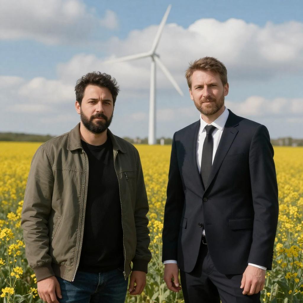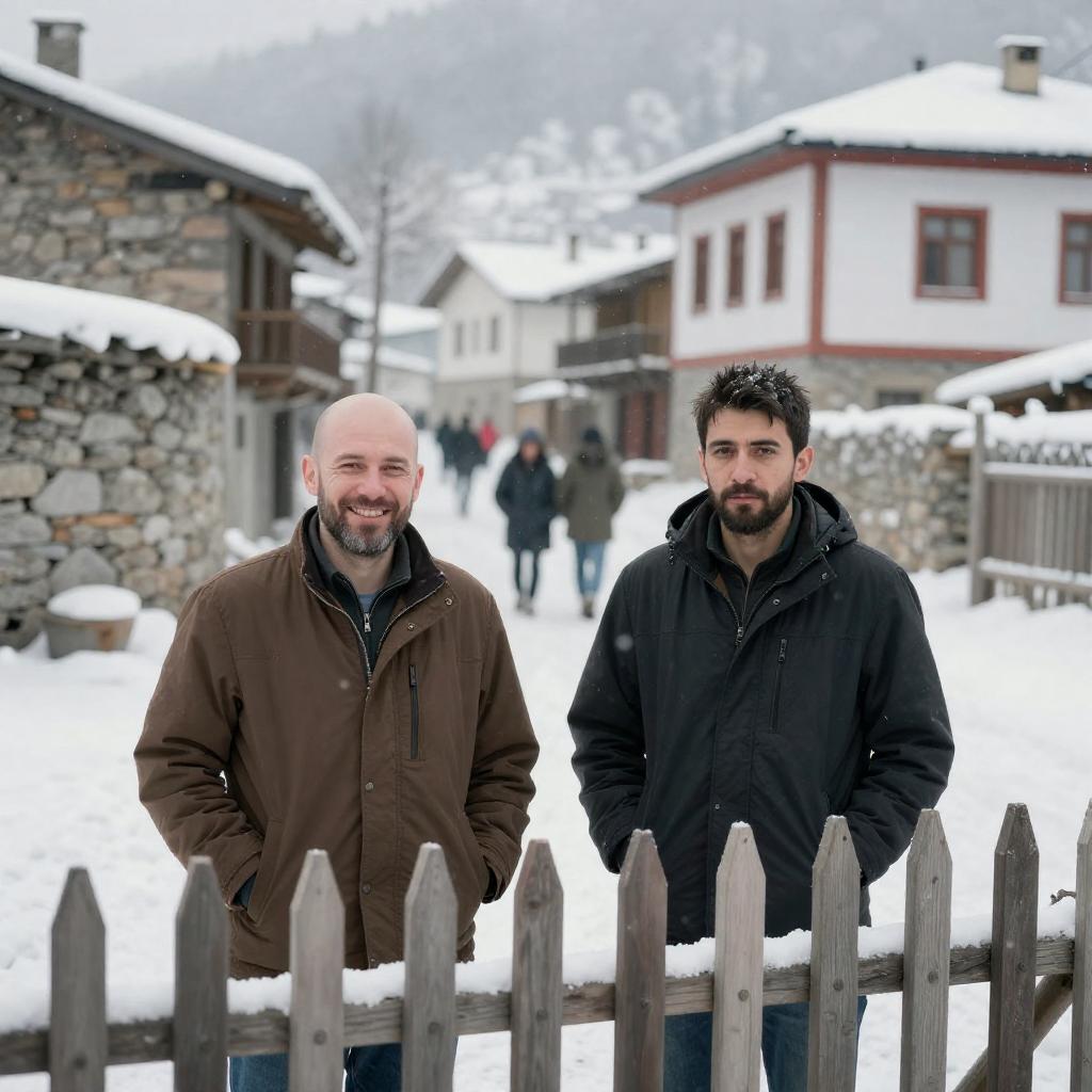 Photograph of two men standing in front of a large, bright blue and white glacier. The man on the left, bald with a gray beard, wears a black jacket and pants. The man on the right, with short brown hair, wears a blue quilted jacket and gray pants. The glacier's icy ure contrasts with the rocky background.