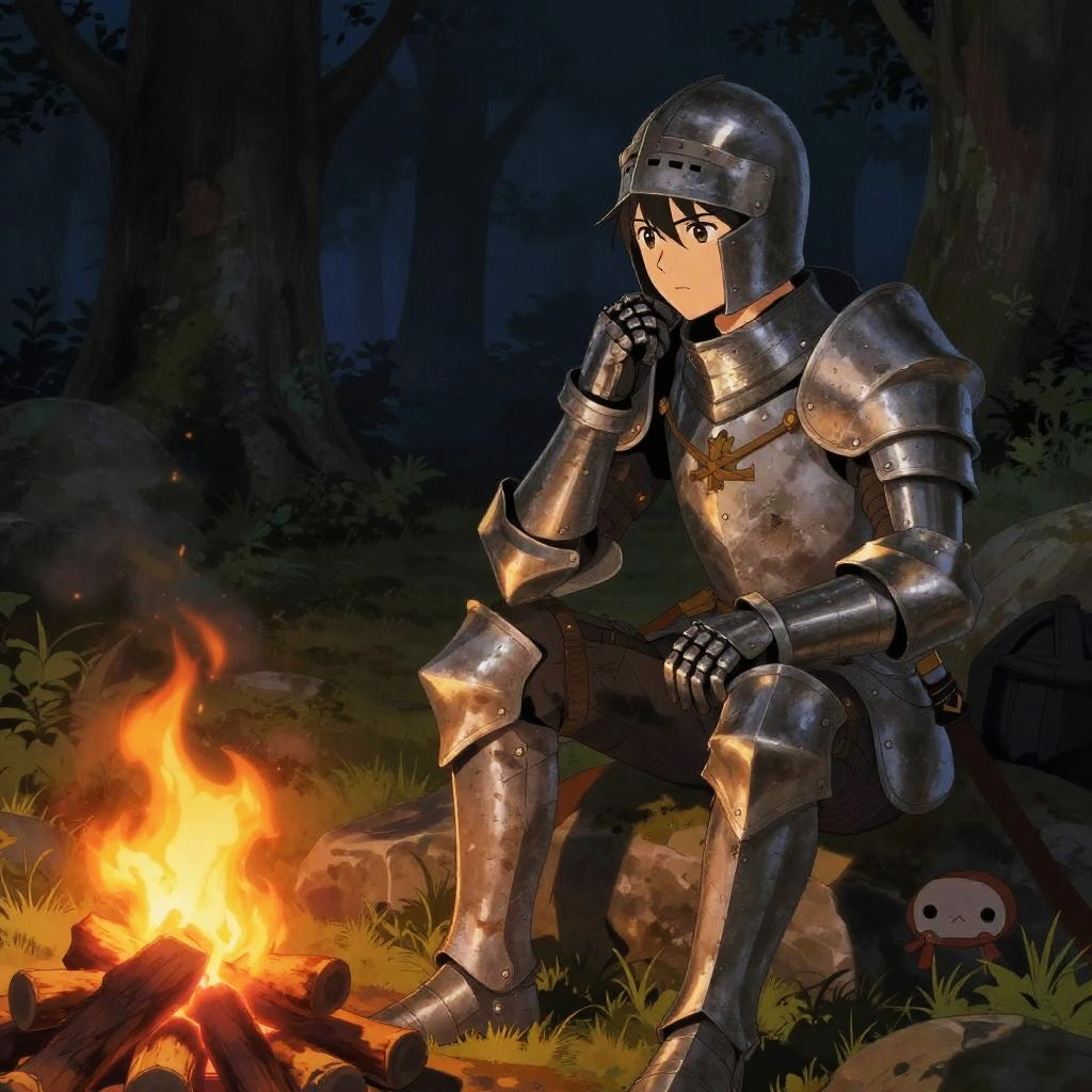 Anime knight art illustrating a serene moment of a lone knight sitting beside a campfire in a quiet forest, detailed medieval armor with scratches, soft warm light illuminating the character's thoughtful expression, highly detailed background, anime fantasy art.