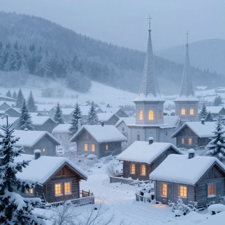 Photograph of a snowy, Nordic village at dusk. Wooden houses with snow-covered roofs and glowing yellow windows are scattered across a snow-covered landscape. Two tall, spired church buildings stand prominently in the background. Evergreen trees, also dusted with snow, frame the village. Mist rises from the ground, adding a serene, ethereal quality. The sky is overcast, contributing to the cool blue and white color palette. The village is nestled in a mountainous area, with distant, forested hills visible through the mist.