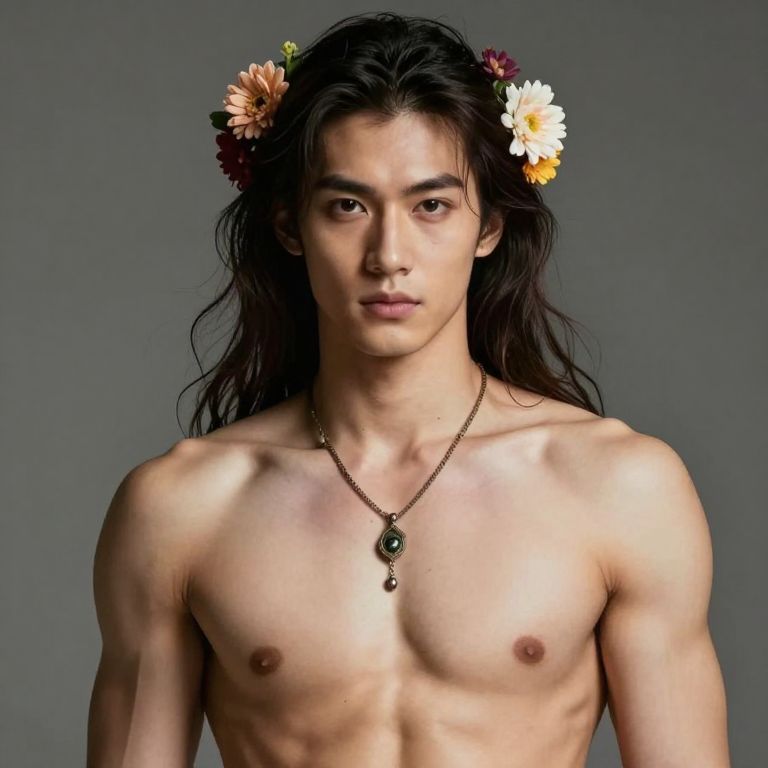 Photograph of a young, shirtless Asian man with long, dark brown hair flowing past his shoulders. He wears a floral crown with vibrant flowers in orange, white, and pink. His skin is smooth and light-toned. He has a slender, toned physique with visible muscle definition. His expression is neutral, with slightly parted lips. Around his neck, he wears a simple gold chain with a black pendant. The background is a plain, dark gray, which contrasts with his lighter skin and the colorful flowers. The lighting is soft, highlighting his facial features and chest. The overall style is natural and minimalistic.