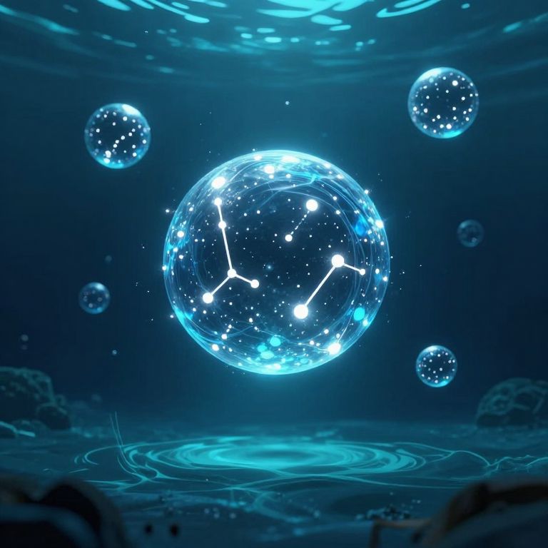 Digital artwork of a glowing blue crystal sphere with constellation-like lights, surrounded by smaller bubbles, floating above a rippling blue surface.