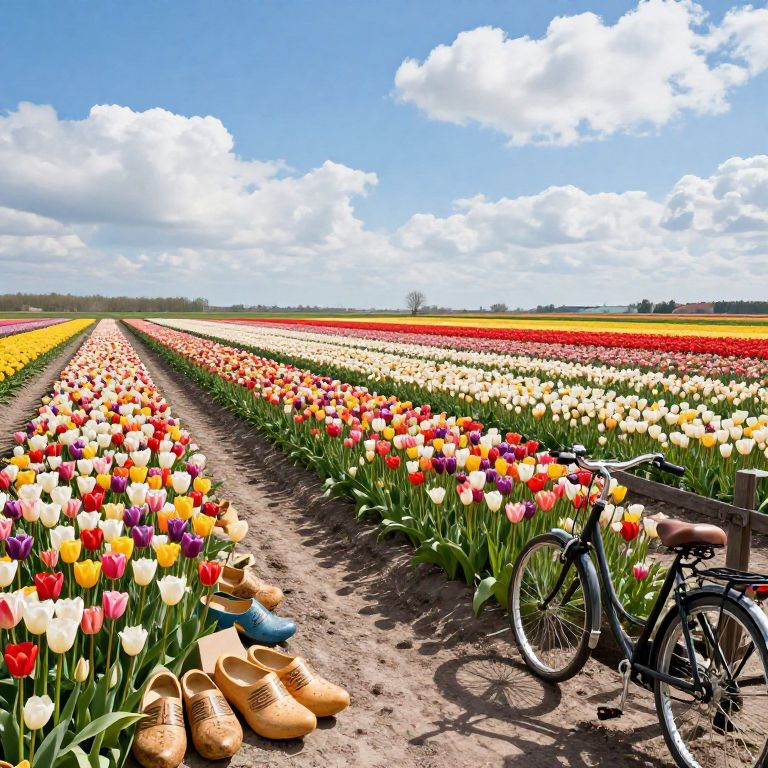 Holand meadow in full bloom during spring, colorful tulip fields in rows, traditional wooden clogs on display, clear blue sky with fluffy white clouds, a vintage bicycle leaning against a fence, warm and inviting rural scene