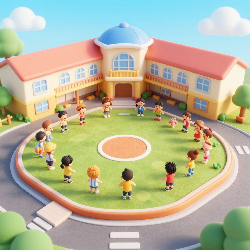CGI image of colorful cartoon children playing in a circular grassy area in front of a yellow and red school building with a blue dome. Bright,