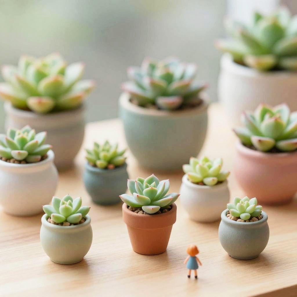 Tinyspo aesthetic, a dreamy desktop with tiny succulents in colorful pots, miniature figurines, and soft natural light creating a peaceful and inspiring creative environment