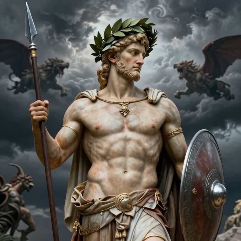 Mitologico scene depicting ancient gods and mythical creatures in a dramatic fantasy landscape, vibrant colors, detailed character designs, ethereal atmosphere, dynamic lighting, reminiscent of classic mythology illustrations.