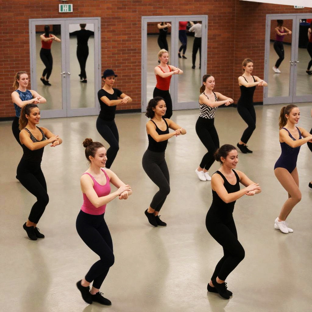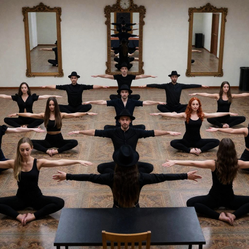 Photograph of a dance class with 11 men in formal attire, black hats, and 5 women with long hair in a dance studio. Men and women are in an extended T-sit position, arms and legs outstretched. Studio has patterned floor, ornate mirrors, and a clock. Men have intense expressions, women have relaxed expressions. Black table in foreground, wooden chairs around.
