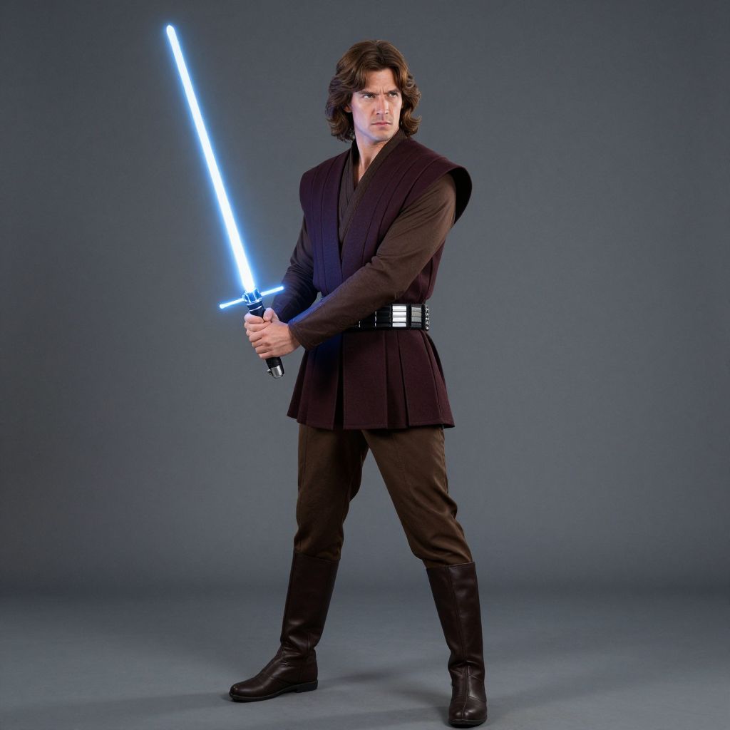 Photograph of a white man with wavy brown hair, wearing a black Jedi robe and holding a glowing blue lightsaber, standing against a gray background
