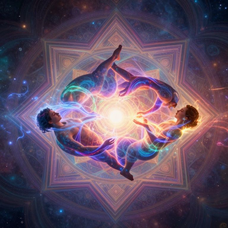 A mesmerizing digital artwork depicting two figures merging into one during a transcendental meditation scene, with their forms intertwining and luminescent energy flowing between them. The background showcases an intricate mandala composed of geometric shapes and swirling patterns, radiating with mystical colors that evoke a profound sense of spiritual awakening. This panoramic image is captured from an aerial perspective, emphasizing the ethereal beauty and depth of this metaphysical union, reminiscent of Alex Grey's transcendental themes.