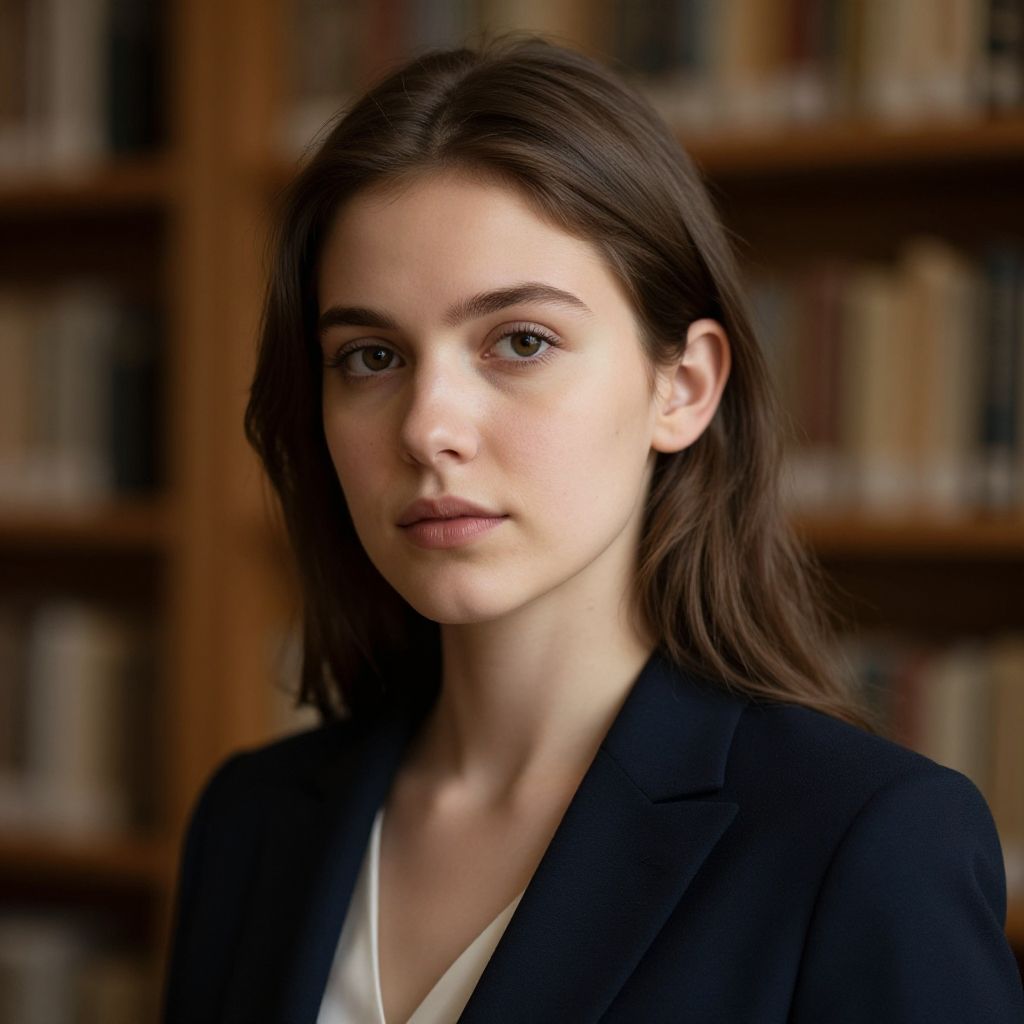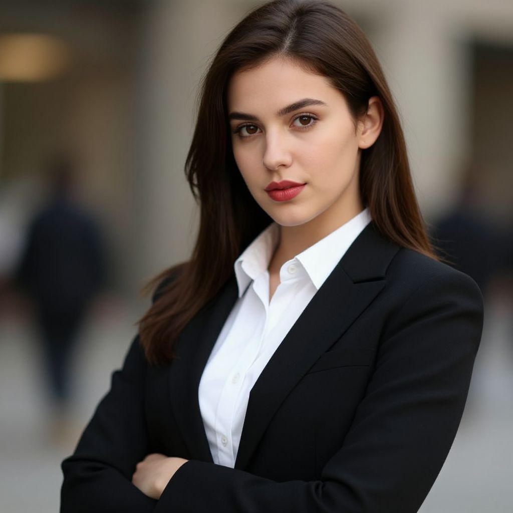 Photograph of a young woman with fair skin and long, straight dark brown hair, wearing a black blazer over a white dress shirt. She has dark, arched eyebrows, brown eyes, and bright red lipstick. Her expression is neutral, and she stands with her arms crossed. The background is blurred, featuring indistinct figures and a urban street scene with muted colors. The focus is on her, with a shallow depth of field highlighting her face and attire. She exudes a professional and confident demeanor.