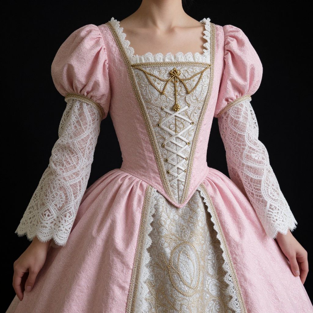 Woman wearing a stunning Europe Medieval Traditional Court Costume, featuring a European Princess Pink Full Dress with intricate lace detailing, puff sleeves, and a corseted bodice, set against a dark background.