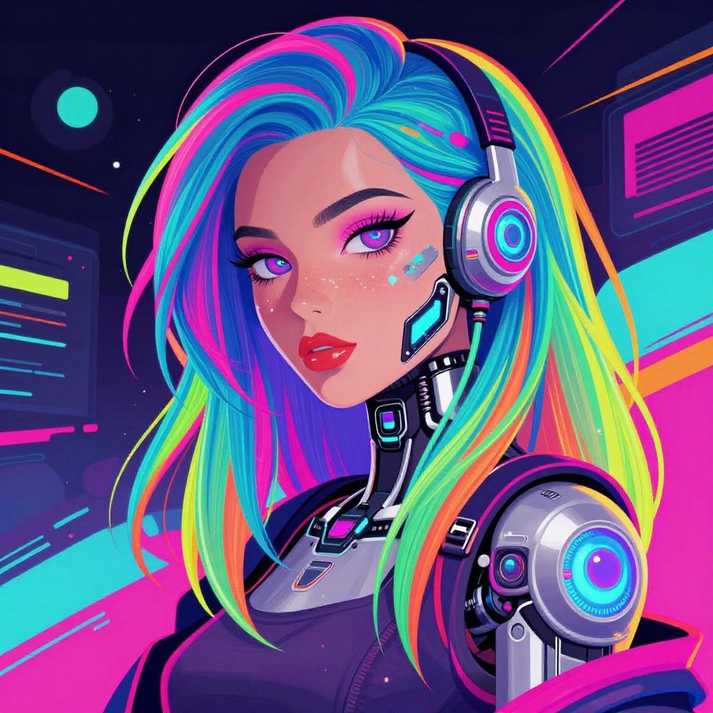 This vibrant and futuristic illustration features a woman with striking neon hair and cybernetic enhancements, set against a backdrop of colorful digital elements. The artwork embodies a dynamic blend of sci-fi and cyberpunk styles, showcasing intricate details and a bold color palette that captivates the viewer's imagination.