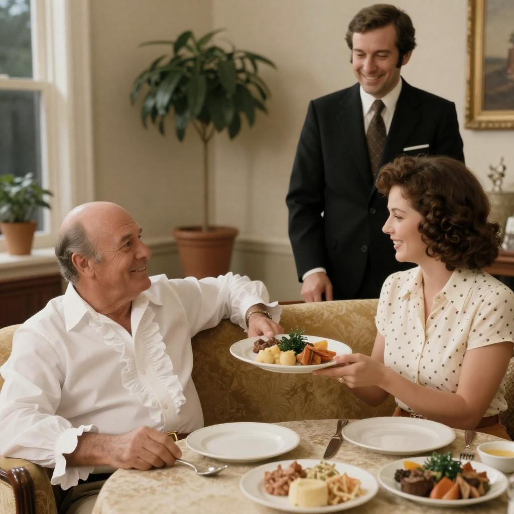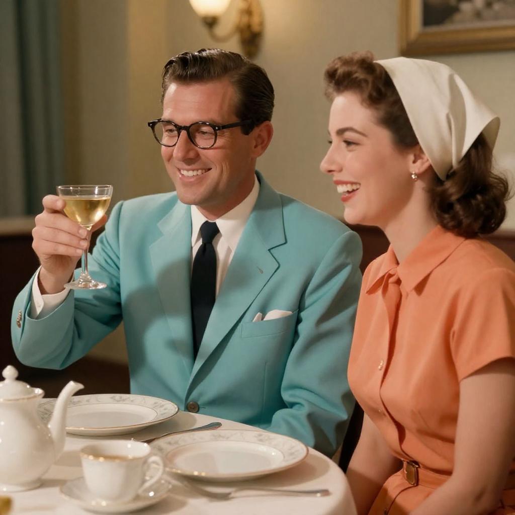 A vintage 1950s-style dinner scene featuring a smiling man dressed in a turquoise suit with a black tie and glasses raising a champagne flute. Seated beside him is a woman wearing an orange dress with a belt and a white headscarf, laughing brightly. The table in front of them is set with elegant white plates, cups with gold rims, and a white teapot. Warm, nostalgic lighting creates a cozy atmosphere reminiscent of mid-20th century dining.